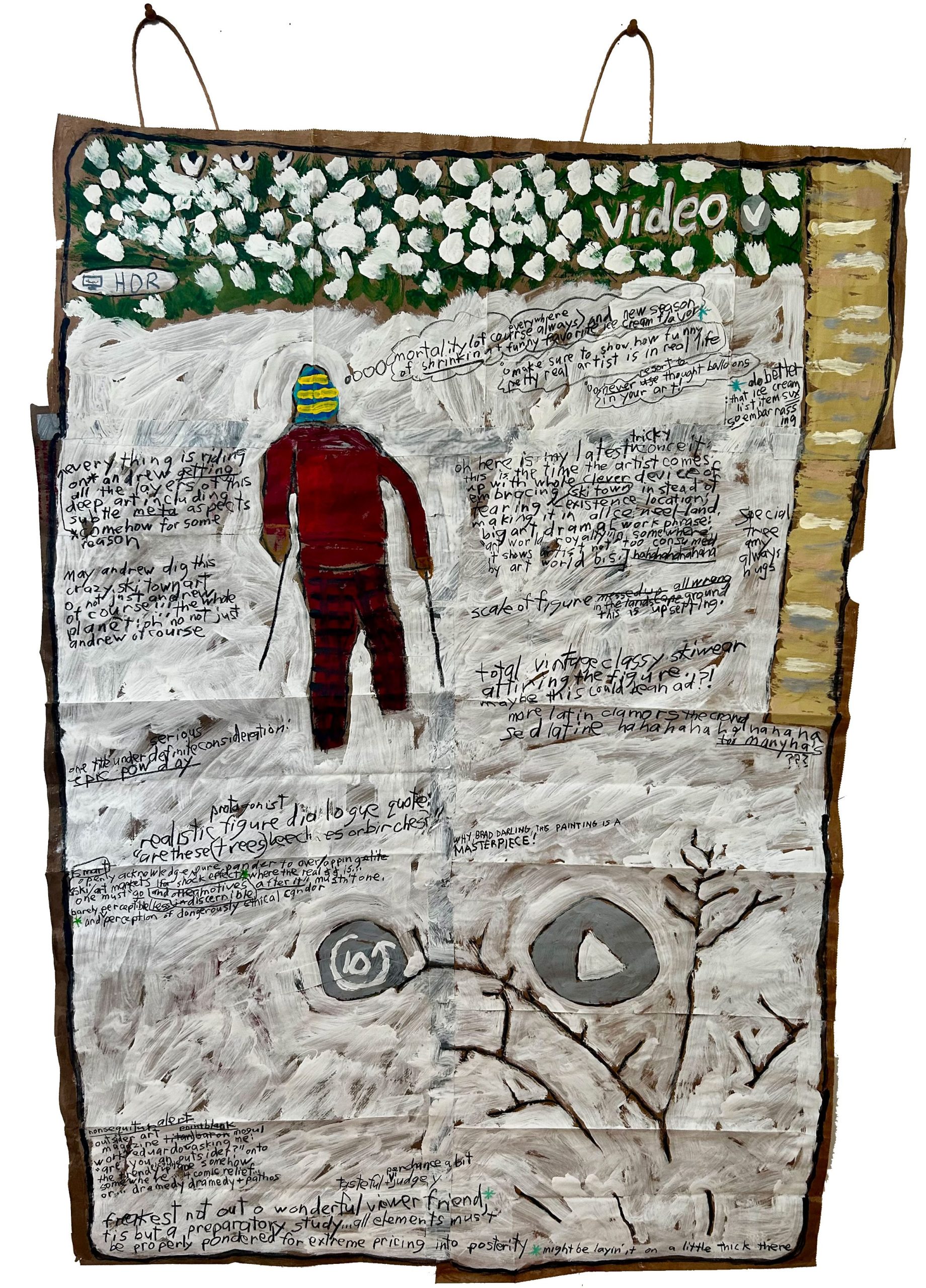 Lors de la conférence avec l’artiste, Haggerty avait écrit des notes en désordre sur deux gros morceaux de carton, ce qui les rendait difficiles à utiliser comme notes. Cela faisait partie du sujet, et néanmoins, en les regardant par la suite, j’ai réalisé que le texte correspondait à la performance. Un descripteur s’est révélé particulièrement adapté au processus artistique de Haggerty : « il y a cette petite section où j’essaie de décrire mon flux de conscience, ce qui est un échec total bien sûr, en raison de mes insuffisances en tant que descripteur du processus de pensée – j’étais soudainement angoissé par l’échec total et complet de mon script mémorisé quand cela m’a frappé : amusons-nous un peu avec ça !! n’est-ce pas ?! » ➆