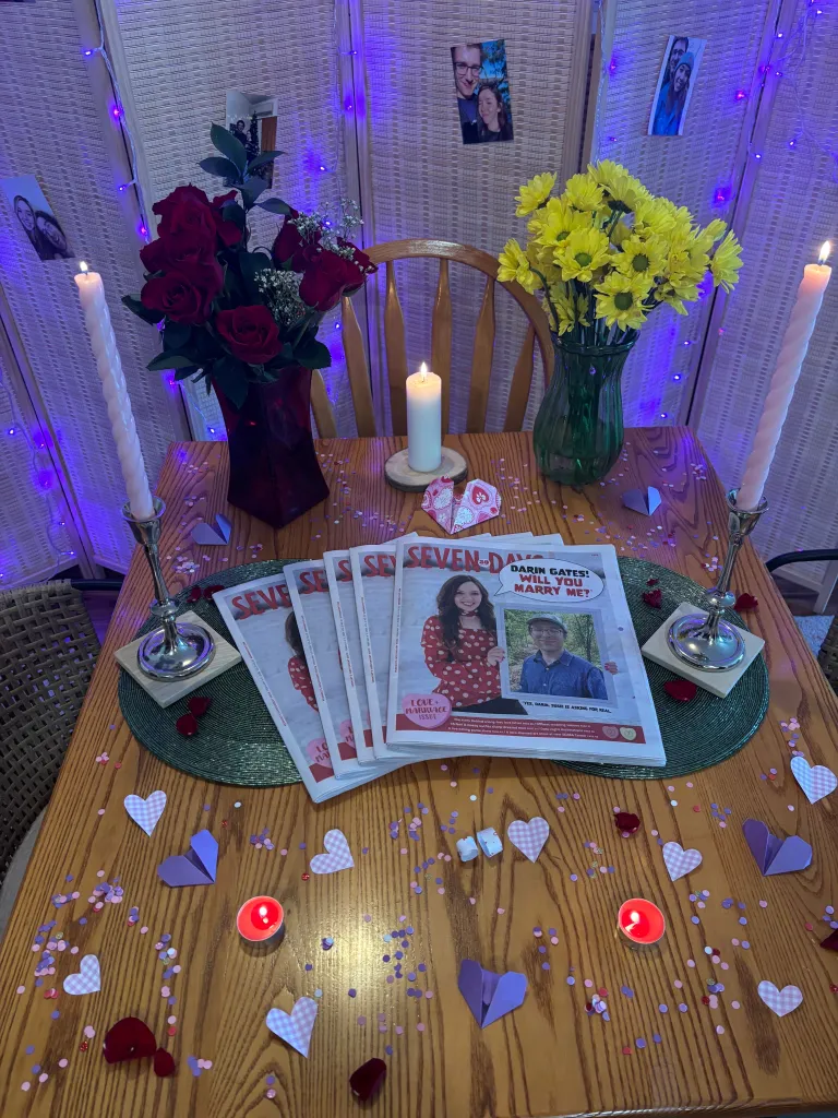 Le matin où le numéro est sorti en kiosque, Susie, en coordination avec un Sept jours chauffeur-livreur, a récupéré plusieurs exemplaires dans un magasin de Middlebury pendant que Darin était au travail. Son plan était de le surprendre à son retour à la maison. Elle a passé la journée à découper des confettis et à fabriquer des cœurs en origami, qu’elle a dispersés sur une table à côté de copies de papier, de photos, de bougies et de fleurs.