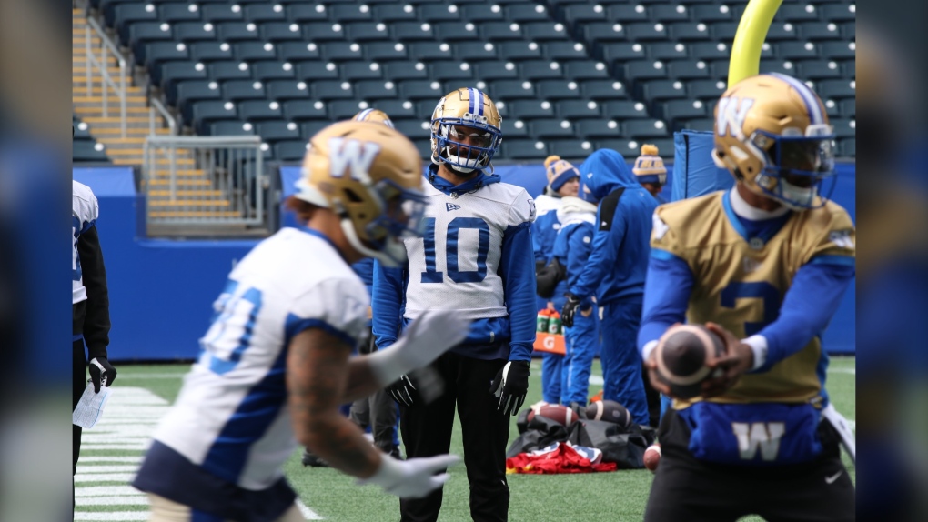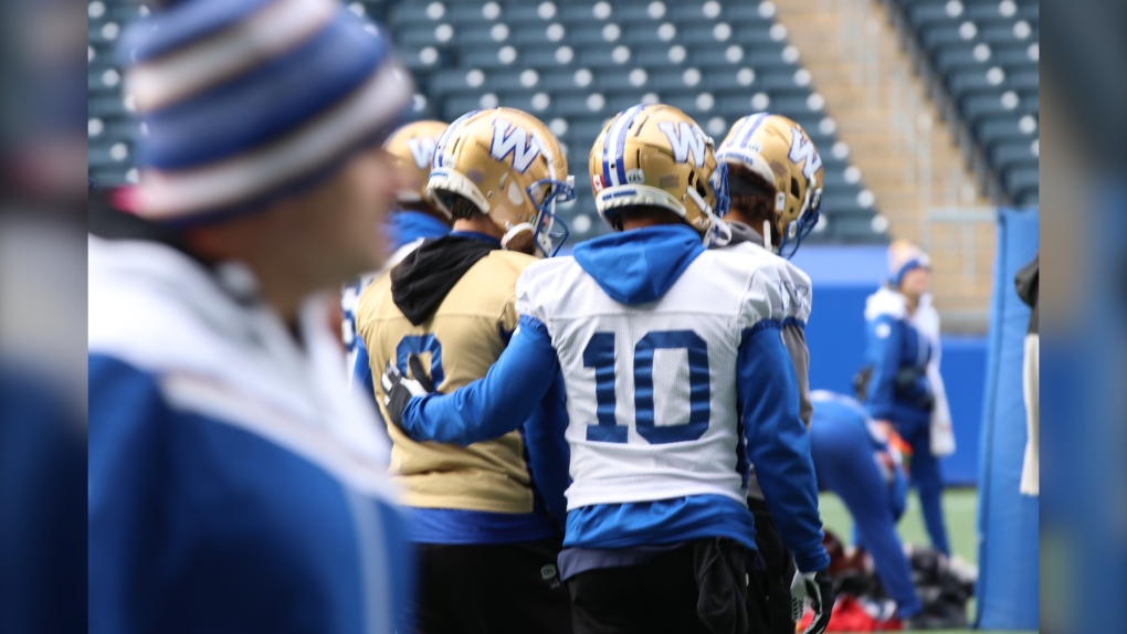 Pendant l’entraînement d’équipe, Nic Demski regarde vers l’avant alors que le quart-arrière suppléant des Blue Bombers de Winnipeg, Terry Wilson, passe le ballon à Brady Oliveira, un autre ancien élève de l’école secondaire d’Oak Park. Demski et Oliveira ont tous deux grandi au lycée de Charleswood et étaient membres du programme de football des Raiders. Cette pratique a eu lieu le vendredi 1er novembre 2024. (Joseph Bernacki/CTV News Winnipeg)