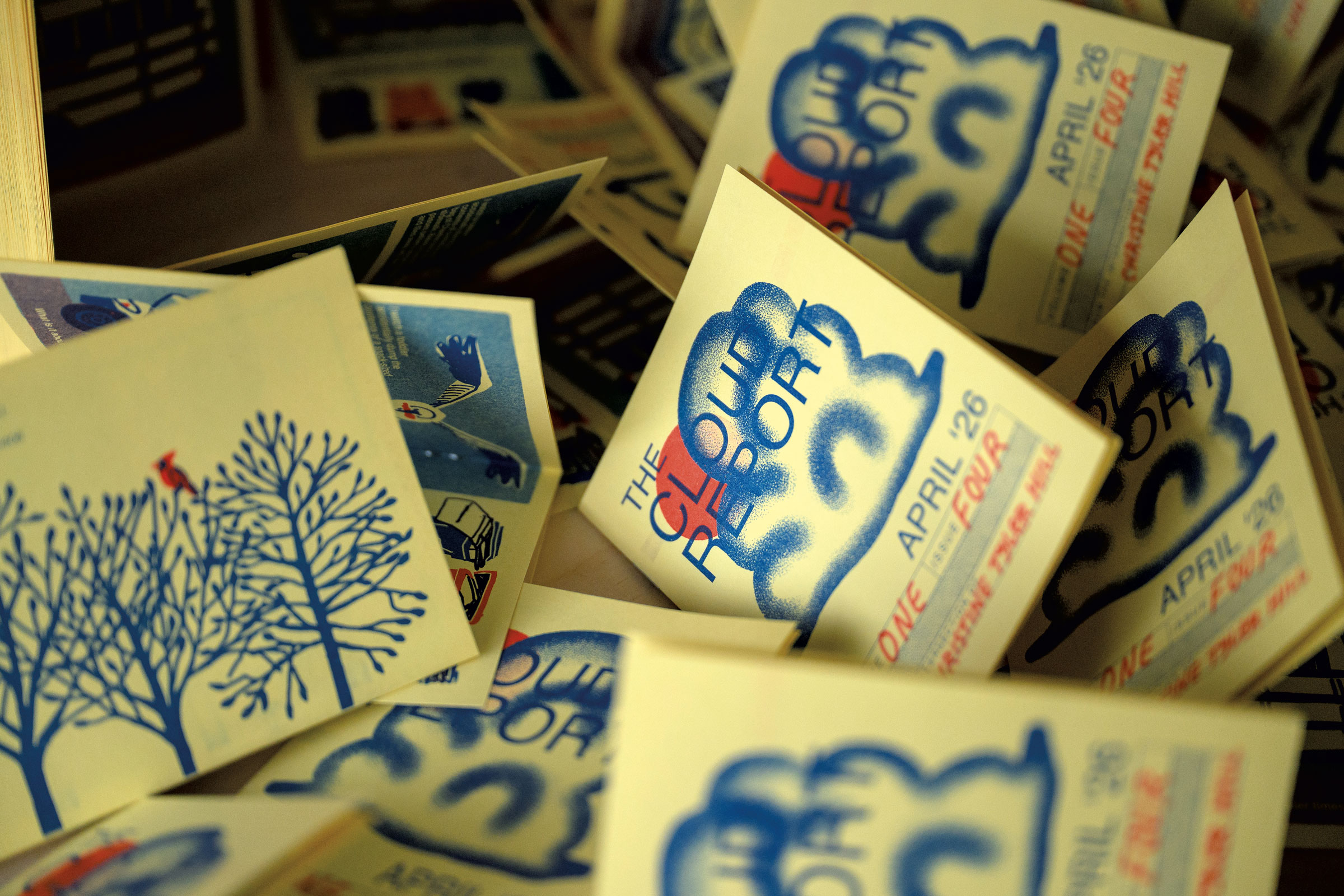 Chaque livret de huit pages de 4 x 5,5 pouces s’ouvre avec des vues du ciel et la date, l’heure et la température indiquées sous chaque image. Ils ne ressemblent pas exactement à des photos, car les zines sont produits sur une imprimante Risograph, une technologie qu’un encart du numéro de février décrit comme « un hybride de sérigraphie et de photocopieur ». Le Risograph donne aux nuages ​​et aux autres illustrations bicolores – bleu et noir dans les trois premiers numéros, bleu et rouge dans le quatrième, envoyé cette semaine – un aspect doux et invitant, comme l’équivalent visuel d’un denim usé.