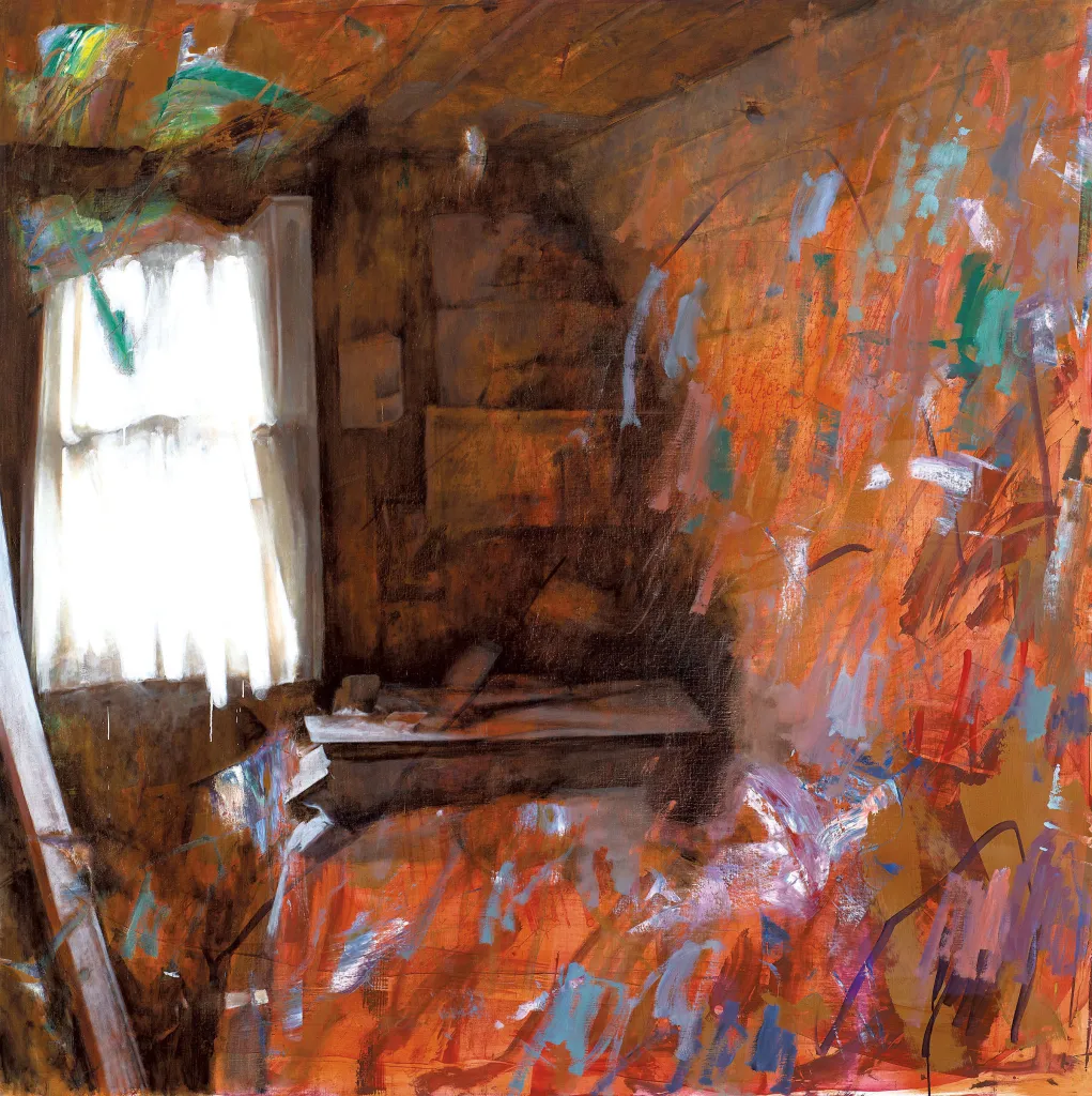 Quand il était enfant, a déclaré Stamer, lui, son frère jumeau et leurs amis exploraient souvent des maisons rurales abandonnées. Ses souvenirs de ces lieux sont devenus une source d’inspiration pour ses peintures, qui mélangent des coups de pinceau gestuels et des éléments abstraits avec des intérieurs réalistes. Après avoir travaillé auparavant à partir de photographies de référence, Stamer a maintenant commencé à décrire ses souvenirs à l’IA et à incorporer des éléments des images qu’elle produisait. De temps en temps, peut-être une génération sur cent, DALL•E ajoutait quelque chose – ou quelque choseun – sur les lieux.