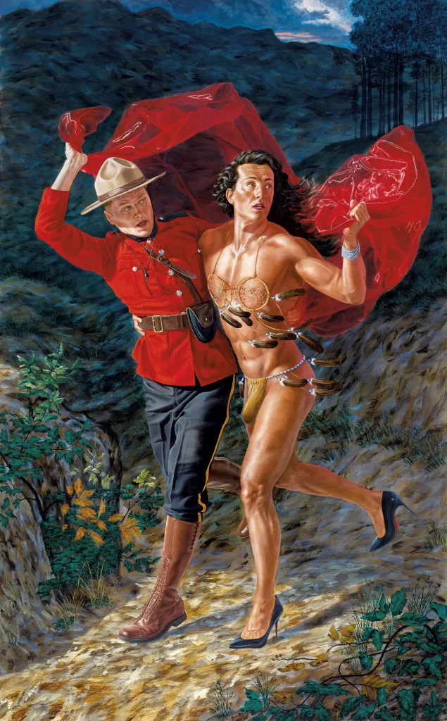 Miss Chief n’apparaît pas dans tous les tableaux, mais Monkman l’utilise très efficacement pour relier ses styles et ses sujets. Dans des œuvres telles que « Artiste et modèle » et « Le triomphe de la malice », elle peint de manière presque caricaturale. Elle prend souvent le parti de défendre la culture autochtone contre l’appropriation par les artistes occidentaux – dans un cas, en ligotant un photographe blanc au chapeau de cowboy qui est percé de flèches à la manière de Saint-Sébastien, même s’il n’a pas l’air de se plaindre.