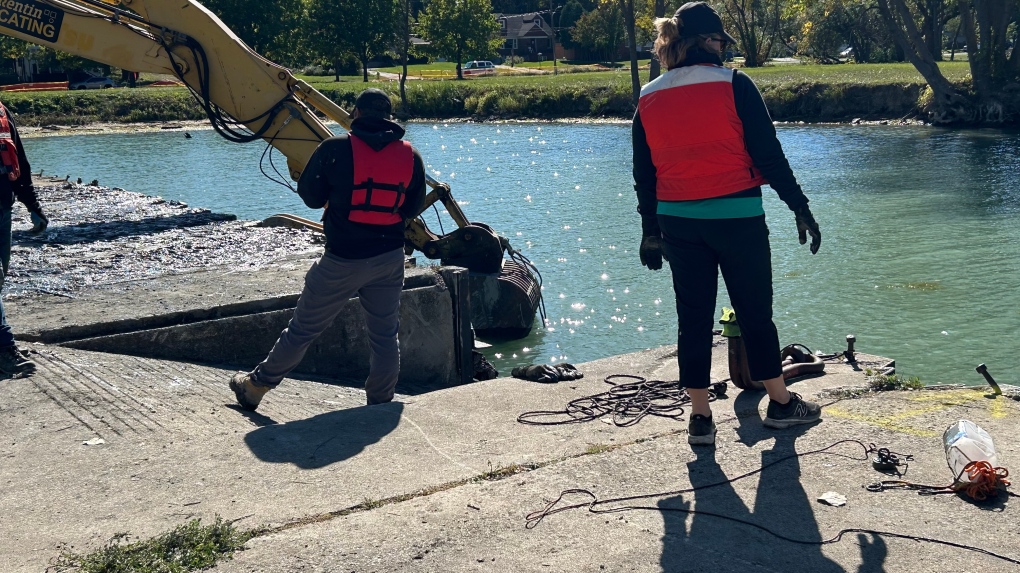 Des équipes au travail récupèrent des voitures abandonnées dans la rivière Détroit, à Windsor, en Ontario. le 9 octobre 2024. (Stefanie Masotti/CTV News Windsor)