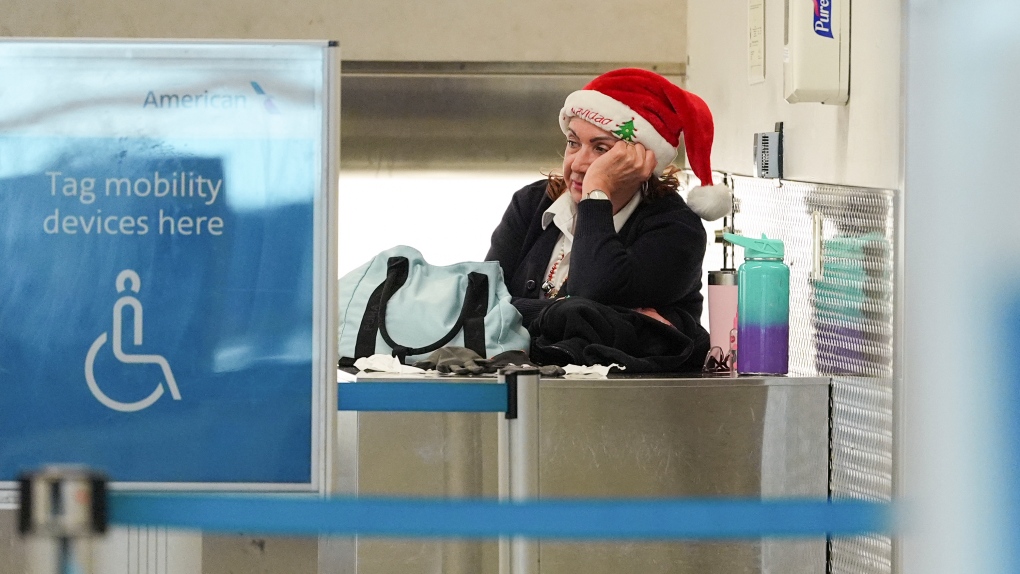 Un employé d’American Airlines portant un chapeau de Père Noël regarde vers les comptoirs d’enregistrement silencieux du terminal américain de l’aéroport international de Miami, la veille de Noël, le mardi 24 décembre 2024, à Miami. (Photo AP/Rebecca Blackwell)