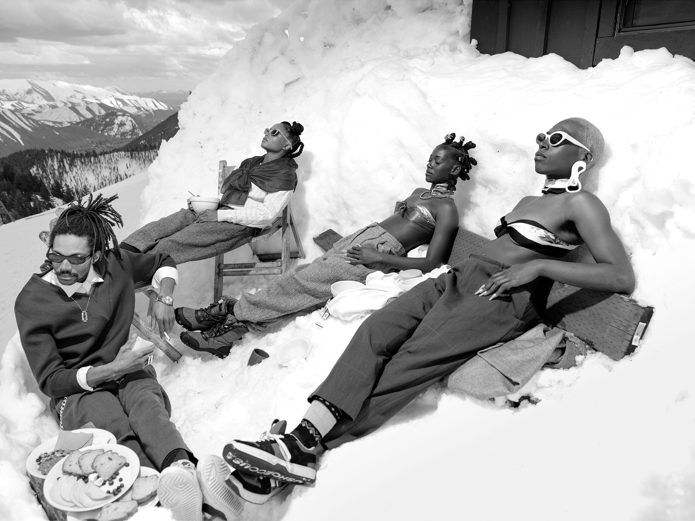 Dans l’autre moitié de la galerie, Sofía Jaramillo focalise sa caméra sur qui est dans le paysage. Dans une série d’images en noir et blanc nettes et soignées, elle recrée des photos de ski classiques des années 1960, mettant en vedette des personnes non conformes au genre et LGBTQ et des modèles de couleur comme sujets. Le photographe est d’origine colombienne et a grandi à Sun Valley, dans l’Idaho, où les photos des stations de ski du milieu du XXe siècle ont façonné une perception des pistes de ski comme étant trop blanches. Dans ses réimaginations, divers skieurs ont toujours fait partie de la scène. Talbot-Kelly a renforcé ce message en installant certaines des images de Jaramillo sous forme d’impressions de la taille d’une bannière au Sugarbush Resort.