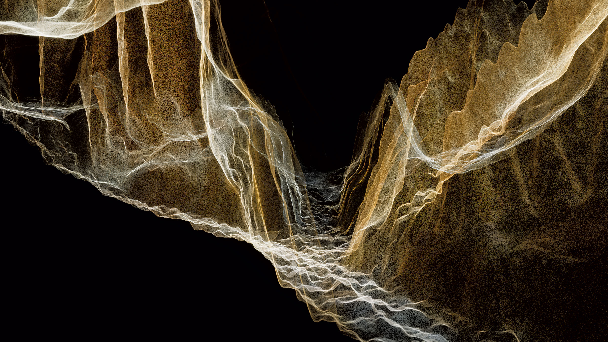 « Terra Montane » de Brad Johnson, une installation vidéo à six canaux également diffusée en boucle dans la galerie, aborde également la façon dont nous conceptualisons un paysage en fusion, mais dans une perspective très différente. Grâce à des projections superposées et à une bande-son atmosphérique et expérimentale, Johnson nous donne des images de montagnes et de grottes de glace, à la fois réelles et réalisées à partir d’animations de points de données mesurant le terrain. L’information est restituée sous la forme d’une topographie fantomatique, apparemment à la fois présente et absente ; une partie du film est basée sur une maquette du Mont Blanc du XVIIIe siècle. Comme dans le documentaire de Reynolds, les images traduisent nos tentatives de comprendre un environnement glaciaire alors même qu’il est en train de disparaître.